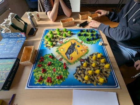 Le verger est un jeu coopératif et concurrentiel à la fois. Il est très apprécié des enfants car ils sont ensemble contre le corbeau mais éprouvent de la satisfaction à collecter les fruits dans leur propre panier.
